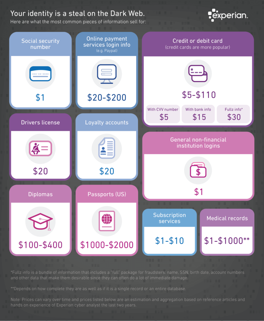 Just take for instance this small example of what identity data is worth on the dark web in this Experian infographic from 2017. Even though this infographic is outdated this demonstrates the real costs associated with identity theft most likely from data breaches and other data mismanagement. Values range from about $1.00 for Social Security numbers to $2,000 for US passports.
